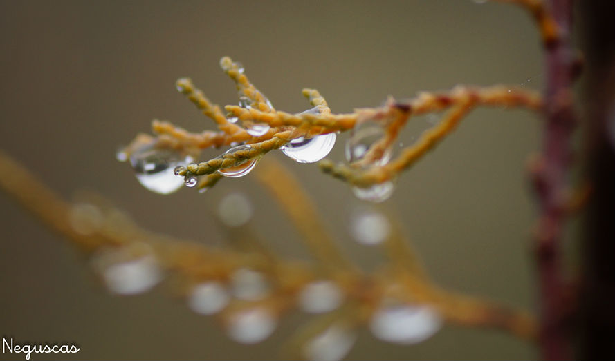 Gotas de rocío matinal, día de niebla. Orillas del Ebro. Zaragoza